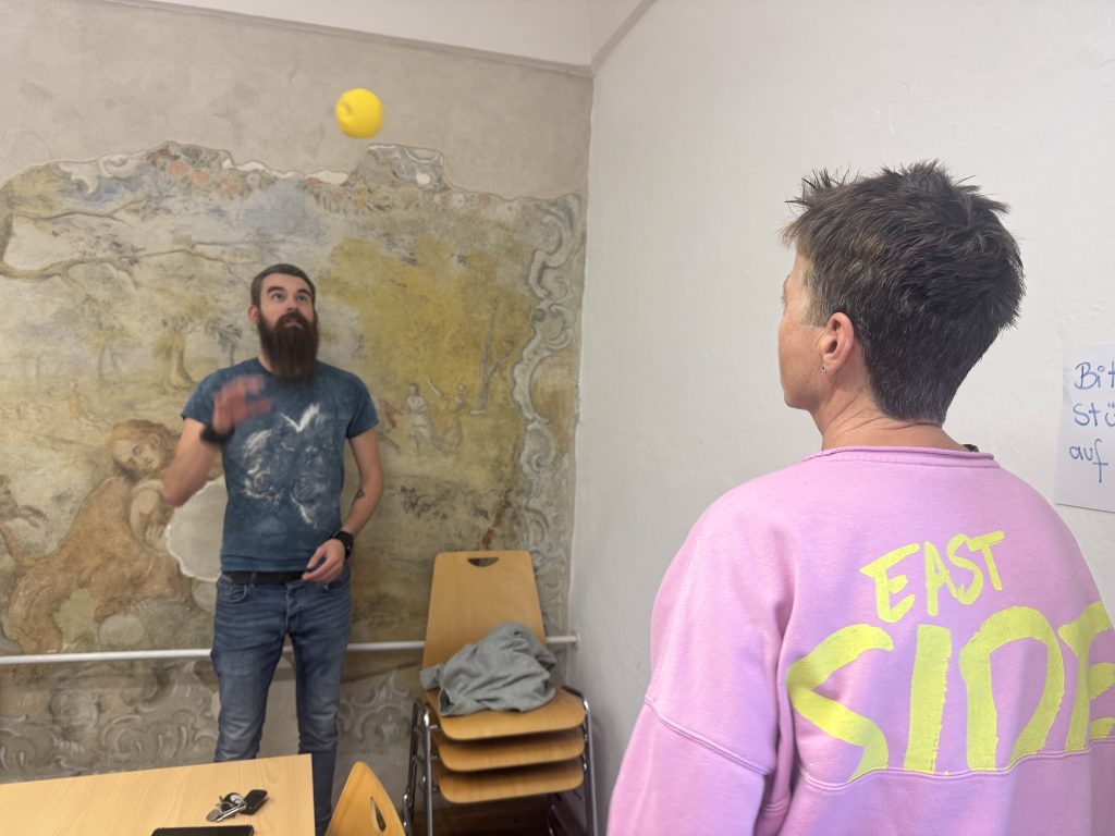 Einen Ball zu werfen und uns dabei ein Tier und eine Farbe auszudenken? Oder eine kleine Aufgabe aus dem Unterricht zu lösen?